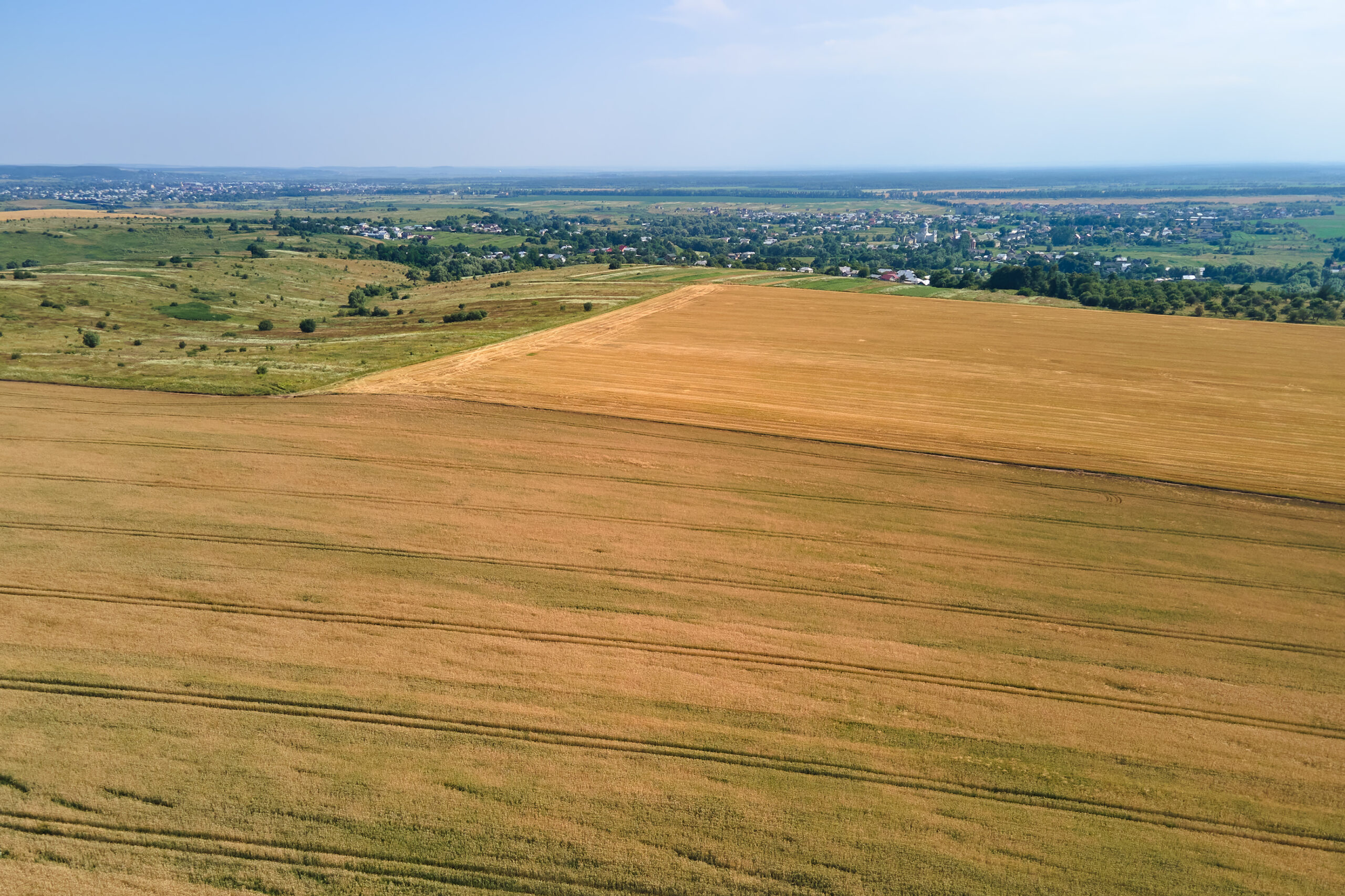 Aerial landscape view of yellow cultivated agricultural field with ripe wheat on bright summer day.