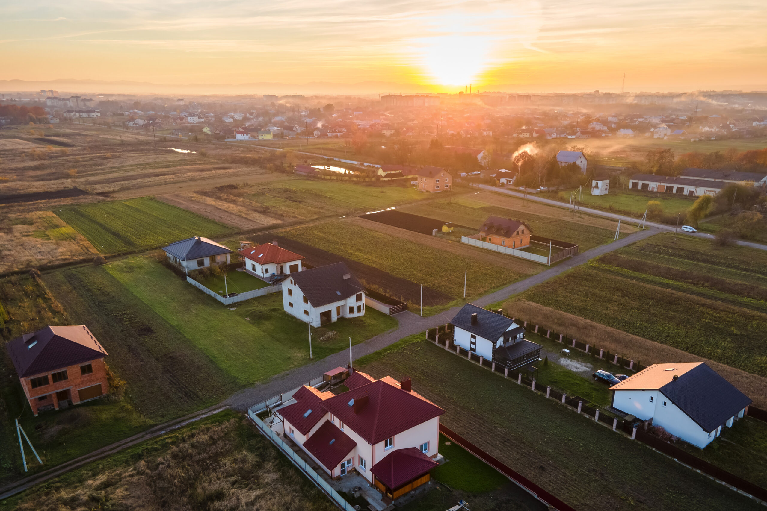 Aerial view of private homes in rural suburban area at sunset.